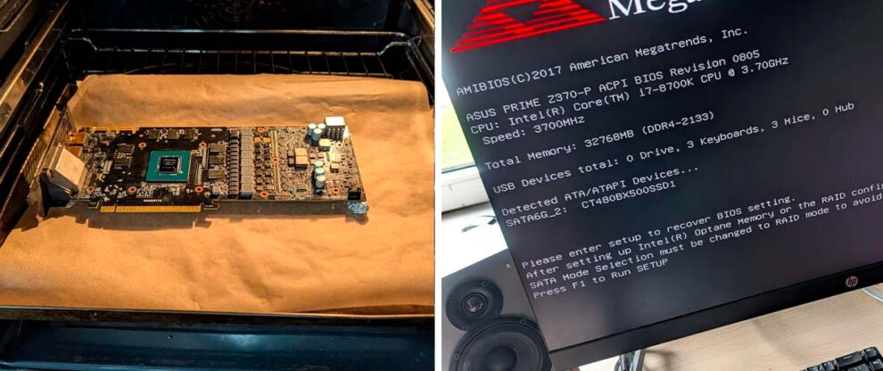 Quando a placa de vídeo, especialmente aquela de estimação, apresenta a temida “tela preta da morte”, o que fazer? Um usuário notável decidiu improvisar em vez de buscar assistência técnica e surpreendeu a todos no Reddit ao mostrar como ressuscitou uma GeForce GTX 1080. O método? Assar o componente em um forno a 200°C!