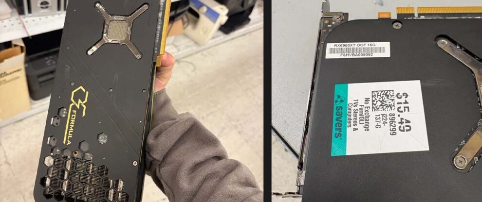 Um usuário do Reddit fez uma descoberta incrível em um brechó: entre muitos eletrônicos antigos, ele encontrou uma placa de vídeo da AMD funcionando perfeitamente! A peça em questão é uma ASRock Radeon RX 6950 XT OC Formula de 16 GB, que foi adquirida por apenas US$ 15,49, cerca de R$ 80 na cotação atual. Sem grandes expectativas, o usuário levou a placa para casa e, para sua surpresa, ela inicializou sem apresentar erros.